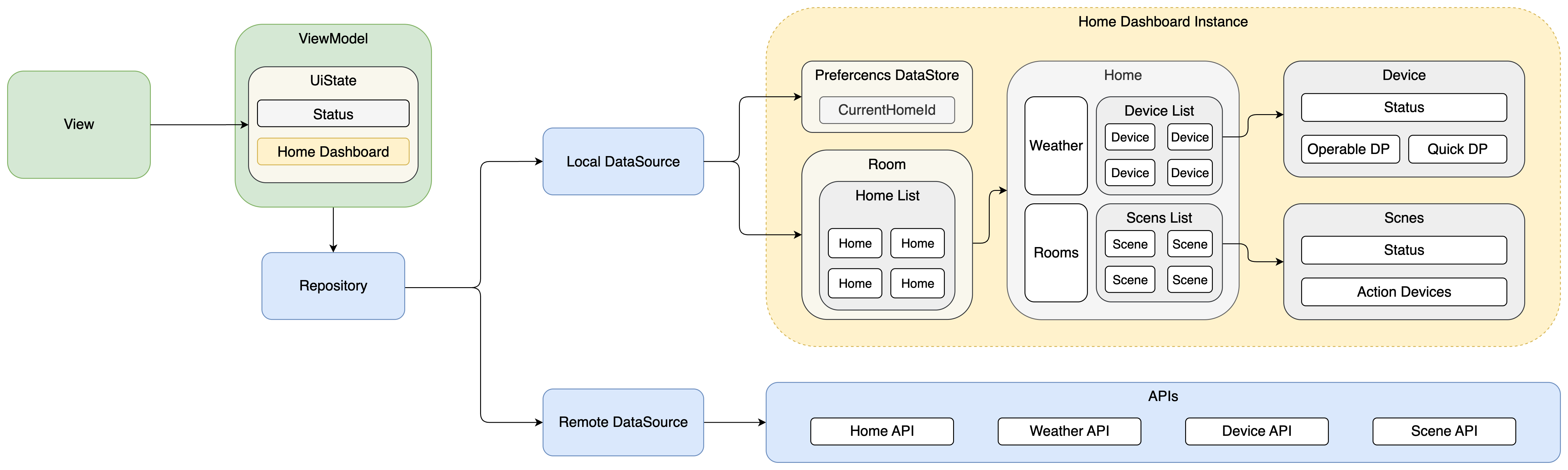 앱이 시작되고 메인 화면이 활성화될 때 ViewModel은 Repository에 서버 데이터 수집을 요청하고 Repository를 통해 관찰 가능한 Local DataSource의 HomeDashBoard를 관찰하고 있을 뿐이다. Remote DataSource으로부터 수신받은 최신 데이터는 Repository를 거쳐 Local DataSource로 흘러간다. 그 데이터는 다시 ViewModel과 View로 전이된다.