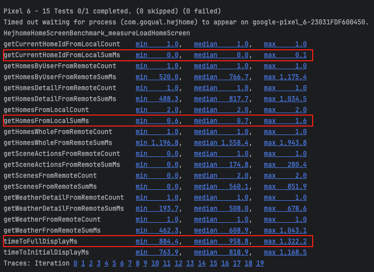 MacroBenchmark를 이용해 로딩 과정을 분석한 결과, 모든 화면 구성요소가 그려지기까지 2.55초가 걸렸다.