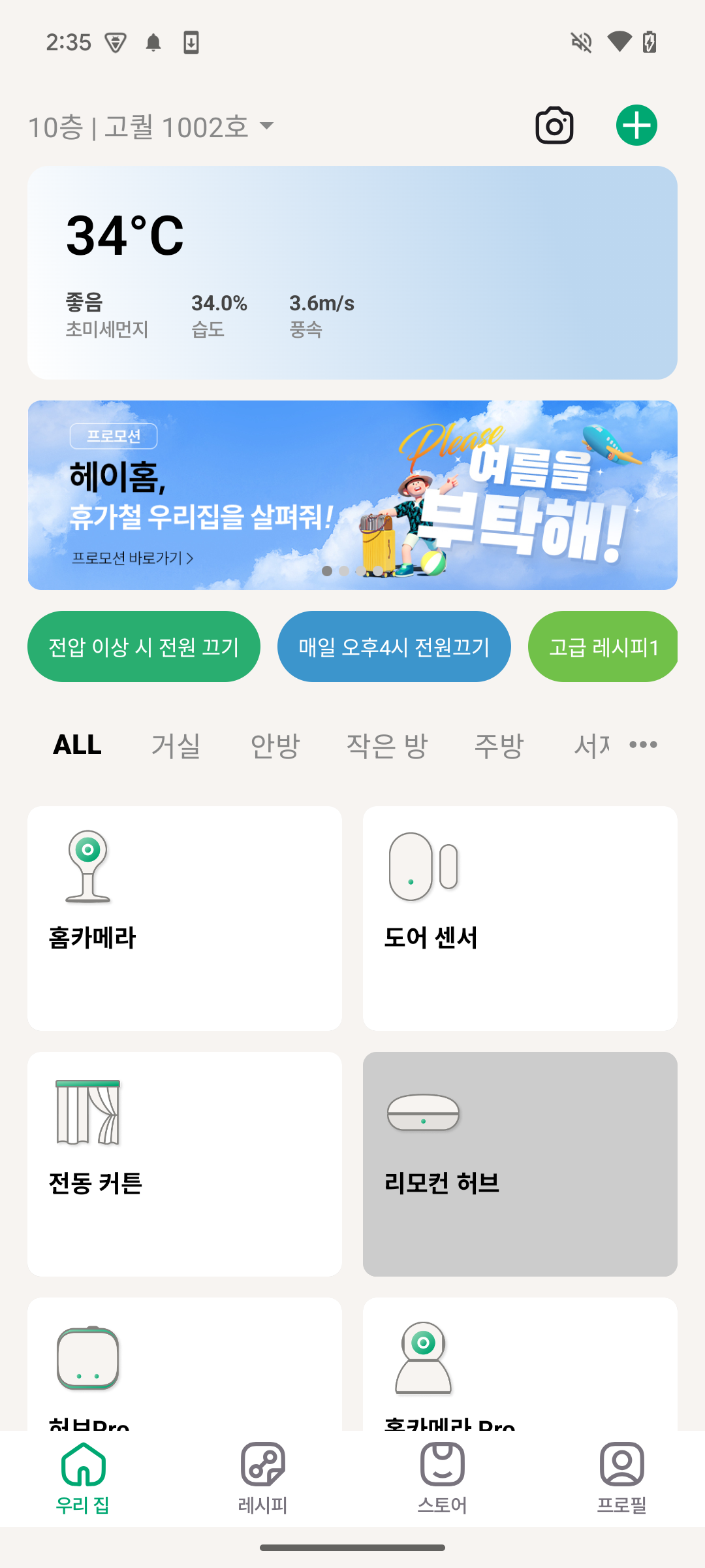 BoxWithConstraints { // 화면에서 스크롤 가능한 높이 val height = this.maxHeight // 방 목록의 높이 var roomHeight by remember { mutableIntStateOf(0) } LazyColumn( modifier = Modifier.fillMaxWidth(), state = parentListState, verticalArrangement = Arrangement.spacedBy(12.dp) ) { stickyHeader { RoomComponent( modifier = Modifier.onGloballyPositioned { // 방 목록 높이 가져오기 roomHeight = it.size.height }, rooms = uiState.home.rooms ) { // TODO } } item { LazyVerticalGrid( modifier = Modifier.height(height - roomHeight.pxToDp()) // 전체 높이 - 방 목록 높이 ) } } }계산된 높이를 LazyVerticalGrid높이에 적용함으로써 기기 목록 상단이 가려지는 문제와 기획 4를 처리할 수 있었다.